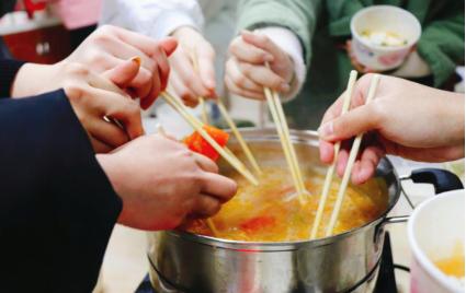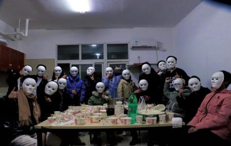 活动开始,同学们齐聚一堂,工作人员带着部分人准备食材,另一部分则在饭桌旁练习分解动作。热腾腾的火锅,满腔热枕的聊着天,氛围激昂又温馨,大家很快融入进来。随后舞蹈舞美部陈相竹部长、唐有唯和刘诗湉等同学开始教大家学习本次的十五秒饭桌舞蹈—“kill this love”,同学们都戴上白色面具,凸显出十足的神秘感,也为本次饭桌舞蹈活动增添了别具一格的独特性。兴趣是最好的老师,每位来参与活动的同学都认真且充满热情地学习着饭桌舞蹈,在欢声笑语中进行着这次活动。