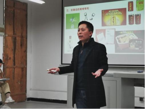 用发条玩具的有趣视频,讲述了自己童年的玩具是如何“摇身一变”挂上淘宝网店,视频引起同学们极大的兴趣,纷纷向曾老师提问发条的原理及专利的形成过程。曾老师用启发式的诙谐幽默的语言一一为同学们答疑解惑,企业发展依托企业品牌的创立,品牌创立的核心即发明专利,可见保护知识产权的重要性。之后,曾老师提到了远景学院特有的厨房,曾老师启发远景学院学生从厨房的餐桌、橱柜等原有物品中激发创新思维,设计出便捷耐用又独具特色的新产品,即推陈出新。