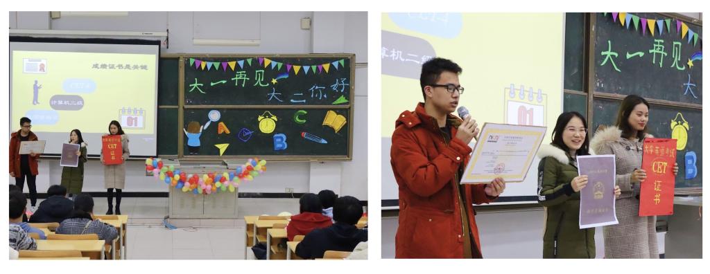 成绩证书是关键。虽然学姐很优秀,但她一直遗憾因各种原因错过CET4、计算机二级考试,也因此错失很多机会。在她的警醒下,由学生干部扮演的证书,包括CET4、计算机二级、教师资格证闪亮登场。生动活泼的表演,不仅使同学们充分意识到其重要性,也鼓励大家克服困难、积极备考,提高个人竞争力。