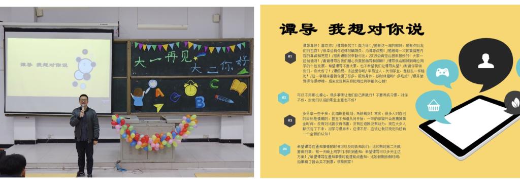 谭导,我想对你说。其实,辅导员只是普通人,也会有出错的时候。年级会前期,谭导通过问卷调查,收集到同学们的评价及建议,借此机会,他为同学们答疑解惑,也开诚布公谈问题。绝大多数同学对他去年的工作感到满意并表示感谢,但也暴露出一些问题,有同学建议“可以不用那么操心,很多事情让他们自己弄就行”、有同学希望“通知事情要更加及时”、还有同学要求“多分享干货,比如职业规划、考研规划”等,谭导一一作出回应,并对同学们的支持与配合表示感谢,也希望新学年与大家共同成长与进步!