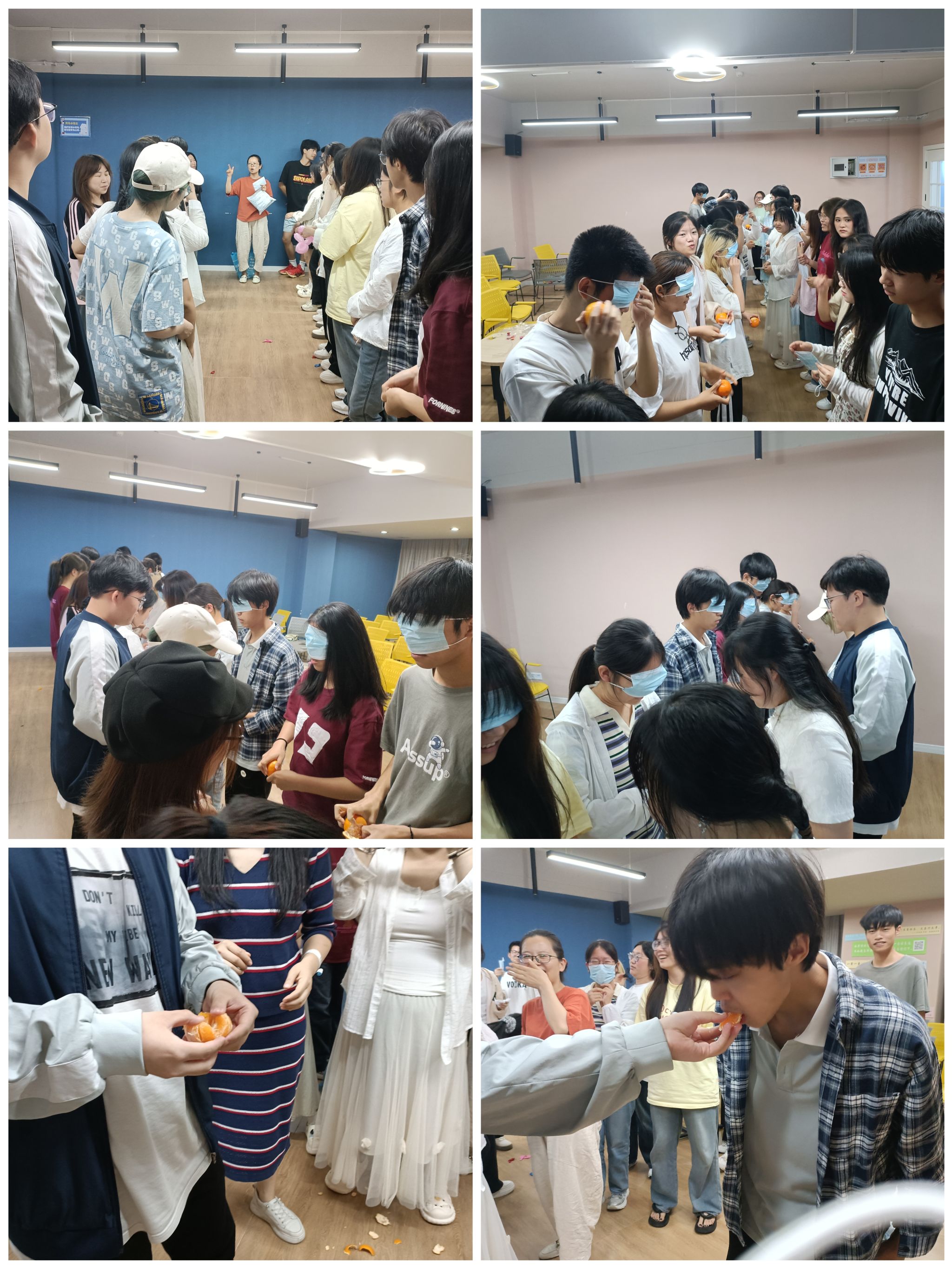 在第二个精彩环节中,供应链管理专业的同学们与健康服务与管理专业的伙伴们相向而立,彼此蒙上双眼,挑战着将橘子剥开并喂到对方嘴中的任务。尽管在这个过程中笑料百出,但这一趣味横生的互动却让同学们之间的更加亲近,彼此间的友谊也在这轻松愉快的氛围中得到了加深和拓展,为大家的交际圈增添了更多色彩和活力。