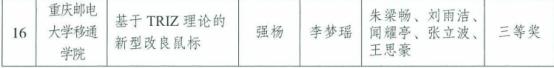 2020年中国创新方法大赛(重庆赛区)暨第三届重庆市创新方法大赛是由重庆市科学技术局、重庆市科学技术协会、重庆市科学技术研究院、重庆市总工会共同主办,由重庆高技术创业中心、重庆三峡学院等单位承办。大赛以“弘扬创新精神,激发创新活力”为主题,分为发明制作类、工艺改进类、创新设计类、生活创意类、创业类和企业类六个组别,旨在为懂创新、会创新、敢担当的创新人才搭建舞台,让企业和大学校园的创新活力在积极竞争的良性循环中得到激发,进一步提升企业和大学生创新创业综合能力,积极营造鼓励独立思考、自由探索和勇于创新的良好环境。自2020年9月份启动以来,大赛共有208项作品入围决赛,学院朱梁畅等5位同学申报的《基于triz理论的新型改良鼠标》作品成功入围决赛,最终获重庆市三等奖。