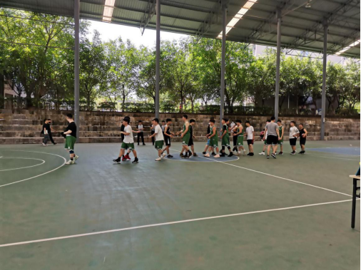 赛前,低年级同学组成的绿队与大四学长组成的黑队友谊性握手,比赛正式开始。