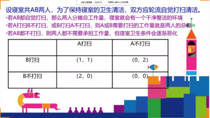 同学们从不同角度分析了现实世界中,不同案例的囚徒困境产生原因,以及分析走出囚徒困境的方式和方法。在朱雪珂和李欢老师的引导下进行了详细的讨论和交流。博弈论策略思维最基本的分析方法就是“向前展望,倒后推理”。也就是在做决策之前,要预测对方可能会采取什么行为,以及这种行为会带来什么样的结果;要明确,最后想达到一个什么样的目标,然后从这个目标倒着往后推,一步一步地确定策略。而囚徒困境中,每个人如果都追求自己的个体理性,选择对自己而言最理性的答案,结果导致了集体的最不理性。看来,指望当事者自己走出“囚徒困境”是不现实的,需要借助适当的外力。