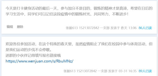 今天的汗水成就明天的健康。活动期间,同学们按时打卡,在家肆意挥洒汗水。虽是线上活动,但工作人员精心策划、同学们积极配合,整体氛围较好。