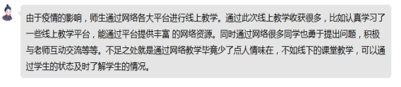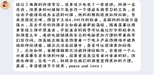 疫情防控时期,大家都以不同的角色“战斗”,虽然我们不能像白衣天使那样奋战在防疫第一线,但网上教学也是我们教师的战场,我们将以更努力、更负责的态度守护好同学们,确保把知识高质量地传授给学生们。期待春暖花开,大家早日重回美丽的校园。