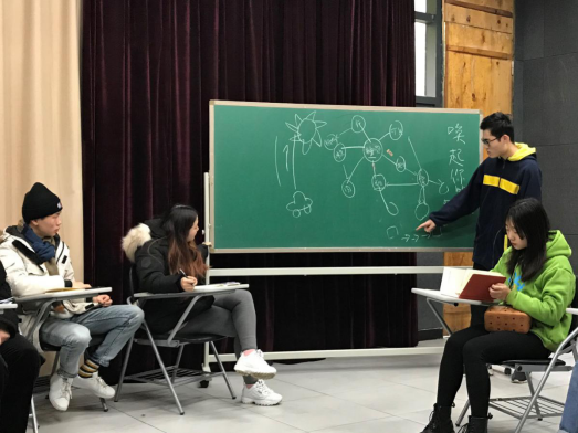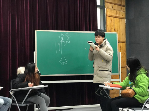 首先,张怀阳同学分享了参与就业沙龙“唤起你的事业心”的心得体会。他依照主讲导师张雪松老师的启发思路,在黑板上画出“车、日、路”的生涯咨询模型,提出一个问题:你们最近耗费最多时间做的一件事是什么?大家都陷入了思考。随后,张怀阳又在黑板上画出“心流”思维导图,解释刚才所提出的问题:通过“心流”的延伸,我们或许能寻找到与自己未来职业相关的信息。