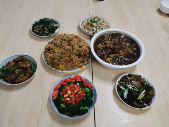 餐前,同学们亲自下厨,准备了可口的菜肴等待老师们的到来。