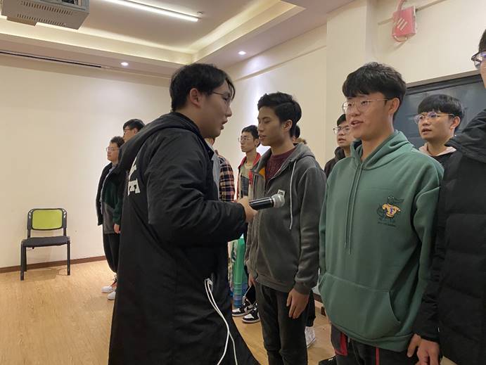 12月1日,在之前的练习中,各声部对自己负责的模块已有了具体的认识,在这次的排练中,除了各声部的合作以外,队长也对如何更好地展示表演进行了指导和调整。为让大家学会发声的技巧,队长更是比喻、动作连番上阵。