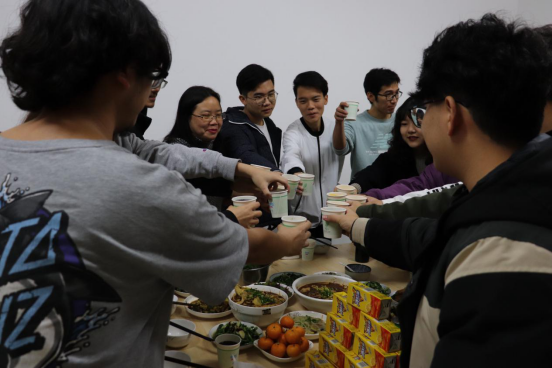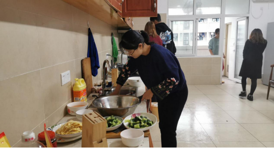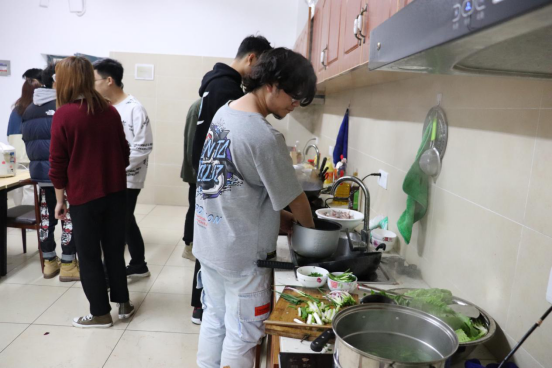 饭菜的香味与相谈甚欢的氛围让整个厨房充满了家的温馨。未掌厨的同学们将菜端上饭桌,并为大家盛上米饭,在邀请老师们入座后,所有人一起为本次的欢聚而举杯。老师们对同学们的厨艺也是赞叹不已,还与大家一起分享了他们平时做菜的小秘诀,在交谈之中,大家脸上都洋溢着笑容。