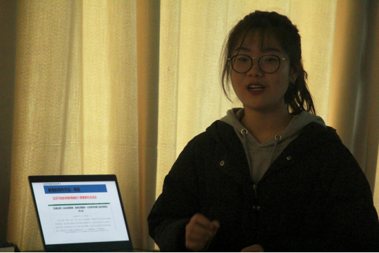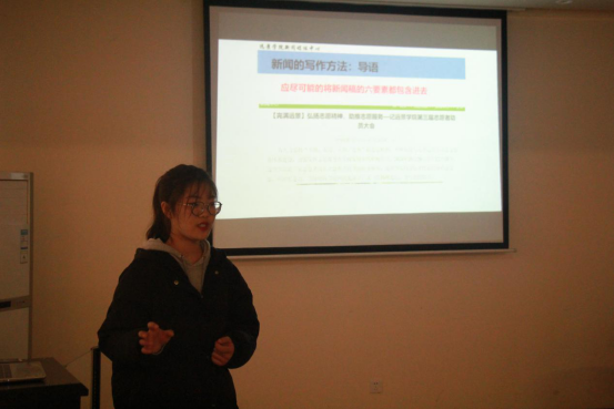 接下来,周雨婷同学给大家讲解了新闻稿的具体的写作方法,新闻稿的内容主要包括:导语、主体及结尾三个部分。她提到,在撰写导语的部分,需要介绍本次活动中最精彩的事实,要能够借助导语吸引读者的阅读兴趣,更要尽可能的将新闻稿的六大要素包含在导语之内。在主体部分,写作者需要站在宏观角度,分点叙述活动内容,避免口语化,尽量做到“句句有重点,段段有总结”。其次,还需尽可能的展现出部门活动特色,让受众感受到各类活动的不同之处,也便于各部门之间相互交流、学习。