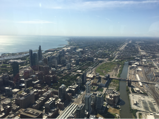 三天的芝加哥之旅即将结束,最后一站,我们来到了芝加哥最高的建筑物——威利斯大厦。威利斯大厦的玻璃观景台位于大厦的103层,乘坐电梯,只需要花55秒就能到达。站在观景台上,50英里范围内的芝加哥城市风貌尽收眼底,巨大的建筑物和密歇根湖在412米的高度下也如同一粒米的大小,除了伊利诺伊州,还能看见印第安纳州和威斯康星州。透过仅1.5英寸厚的玻璃,我们体验到了“一览众山小”的刺激感受。