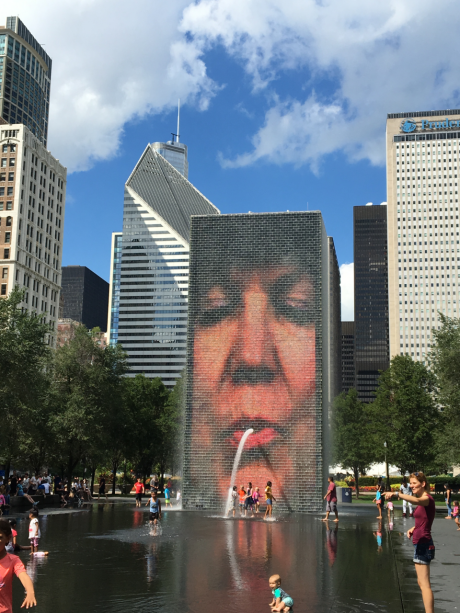 在千禧公园里师生们见到了著名的人脸喷泉,它是由一位西班牙艺术家设计的公共雕塑,夹有电脑控制屏幕,轮流播放着芝加哥市民的笑脸,还时不时从口中喷出水柱,欢迎世界各地来访的游客。在炎热的天气里,这里就变成了孩子们嬉戏打闹玩水的地方。公园里还有一颗特别大的“豆子”,是由英国雕塑家设计的“云门”,由不锈钢拼贴而成,体积庞大,外形特别像大豆,所以被人们称为“豆子”。人们可以透过不锈钢的反射看到如同哈哈镜里一般的自己,还有变形的芝加哥城市街道,享受不一样的视觉体验。