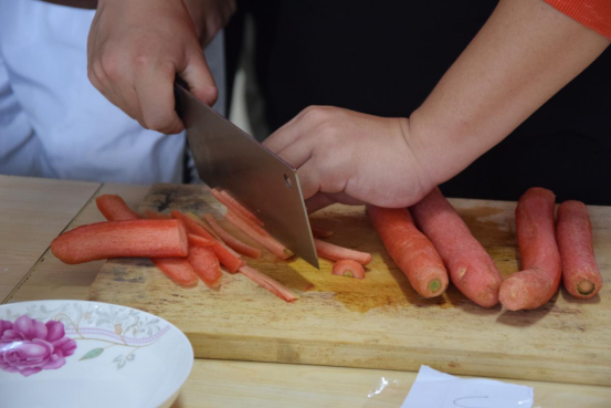 凉菜有“见面菜”或“迎宾菜”之称,凉菜做得好与不好,直接影响到食客对筵席的印象,而做凉菜的考验之一就是较为讲究的刀工技术,直接影响到是否可以呈现出优美的装盘造型等。因此,PK的第一轮就是“刀工”,该环节每队派出一名代表,将准备好的胡萝卜进行切丝处理。一切准备就绪,主持人一声令下,所有队伍风风火火的开始挑战,只见,有的队伍一开始就摸着了门路,下刀快准狠,萝卜丝切得又细又长,引来了其他同学们的夸赞;而有的队伍则是“丈二和尚摸不着头脑”,竟将胡萝卜丝生生切成了胡萝卜丁,引得面前的评委和周围的同学都忍不住开怀大笑。但在过程中,同学们相互指导和借鉴,并对刀工有了进一步的了解,明白了其重要性。其中,杨辉建老师在点评时说到:“刀工是做菜的基础,在下刀之前,同学们需要对食物特性和用刀技巧进行了解,才能达到快准狠,才能得心应手。”此时,杨志学长还亲自上阵,手把手教授同学们切丝的正确方法和技巧,令同学们为之称赞,受益匪浅。