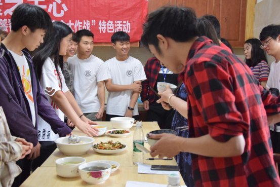 制作食物的时间结束,每组同学把成品端至同一个厨房,由评委老师们进行试吃和点评。十二道各式各样的菜品端到评委团面前,一粥一菜的搭配,简单而美好。还未试吃,视觉上的享受就让评委对同学们表示了一番赞扬。待同学们介绍完之后,试吃开始,评委们进行一一品尝,不一样的菜品,不一样的口味,评委脸上的表情时时也在有趣变换,同学们看着十分好奇和期待。完后评委打分,由工作人员进行统计,得出最后结果。