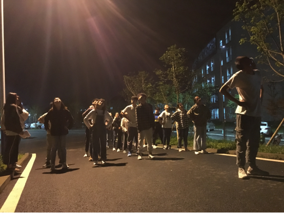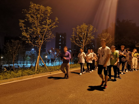 工作人员简单讲述了活动中的要求和安全事项后,便率领队伍开始了夜跑。本次活动和以前略微不同。首先工作人员对以往的队列进行了调整,将速度略慢的同学安排到前几列,后面依次是速度居中、速度稍快的同学在后面的队列中,以达到以达到稳定速度、激励同学的效果。尽管最后队形还是有所变化,但整体效果明显提高。为了照顾同学们的身体状况,队列跑步方向由顺时针改为了逆时针方向,因为逆时针下坡路段较多,也符合常规跑步方向,所以相对于顺时针方向更加省力些。