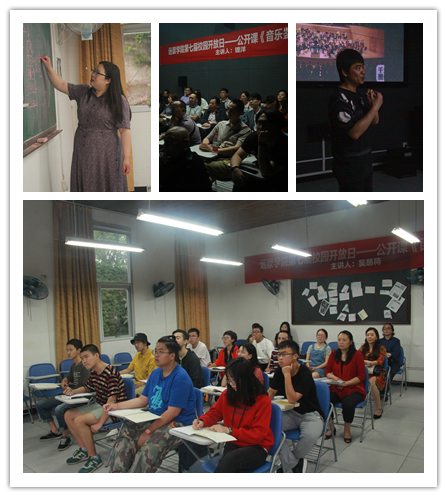 课堂是教学水平最直观的体现,通识课程的小班化、互动式、讨论式教学怎么体现?为了让大家更直观的体验,本届校园开放学院组织了两门课程供大家体验。吴慈荷老师在多功能教室一带来了《西方哲学史》课,她以“柏拉图洞穴理念”引入课程,以书写知识构图使学生和嘉宾进行猜想与思考;锂洋老师则在电影室一为大家带来了《音乐鉴赏》课,他将课程赋予一定的色彩结构,呈现出音乐一般的节奏性,给来宾们带来了深刻的印象。