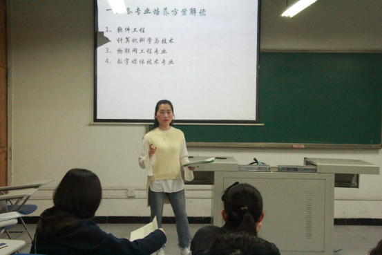 邓秋菊老师,来自大数据与软件学院,主要教授课程有JAVA、数据库和计算机基础教学,也正好是大一大二学生将要或正在面对的专业课程老师。邓老师的讲解共分为四个部分:培养方案解读、专业相关的竞赛、就业和考研。
