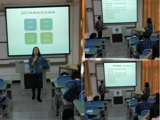 17级培养方案是学校根据专业的不同,以及校内特有的完满教育版块所制定的一系列统筹安排的人才培养方案。当前,17级通识模块分为核心课程,自然科学,艺术与人文,社会科学四个版块,每个版块根据必修与选修,不同专业之间的差别,在选修课程的时候又有所不同。根据这类情况,班导沈涛制定了详细的PPT说明。分别对英语、德语专业,理工类,经管类专业同学进行进步一的说明。