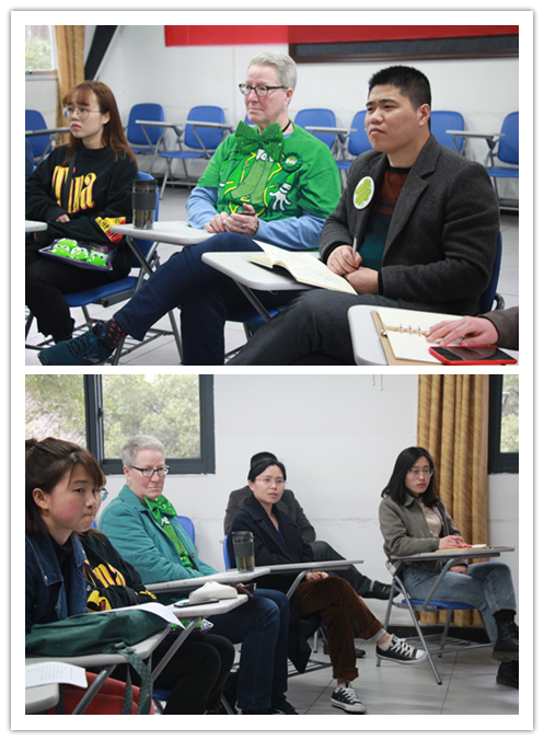 分享会现场大家都饶有兴致地听着,且不时地点头附和,听到有趣的地方时还会笑语连连,室内笼罩着一股轻松愉悦的气氛。听完两人的分享后,关院长亲切地问她们在课余时间有没有去除开圣玛丽学院以外的地方游玩。皮院长则针对学习方面提出了一些问题:“每天平均上课时间多长?”“学校里有哪些专业课程?”沈毅与廖晋文同学也详细地作出了解答。