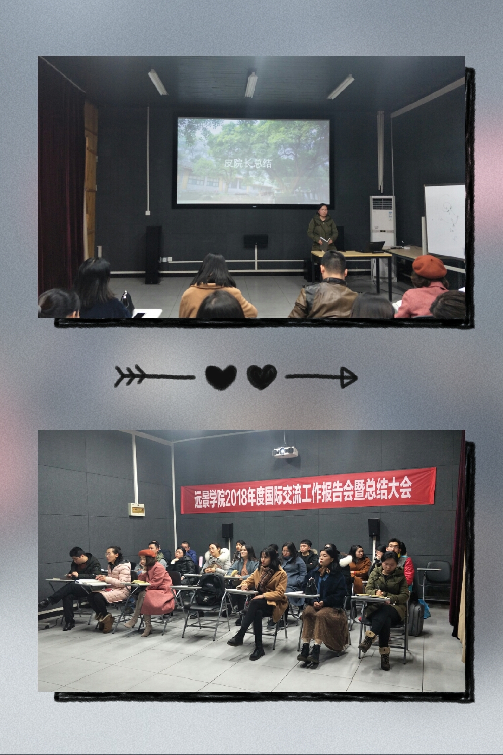 为了总结2018年度国际交流项目执行情况,为下一年开展交流项目、营造国际化办学氛围,开拓师生国际视野,以学生国际游学项目的课堂学习体验、活动经历启发全体教师教育教学工作思路,并鼓励全体远景人努力开拓和维护国际资源,在前期若干次教师、学生专场分享会的基础上,12月12日下午四时,远景学院电影室举行了学院2018年度国际交流工作报告会暨总结大会。远景学院全体教师齐聚,共同聆听2018年内参加国际交流项目的师生们代表讲述他们在大洋彼岸的故事。