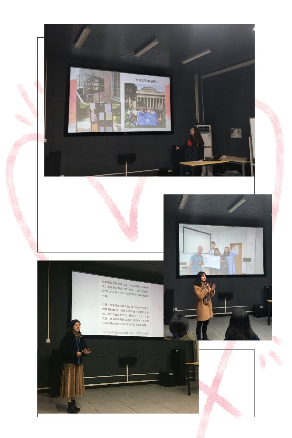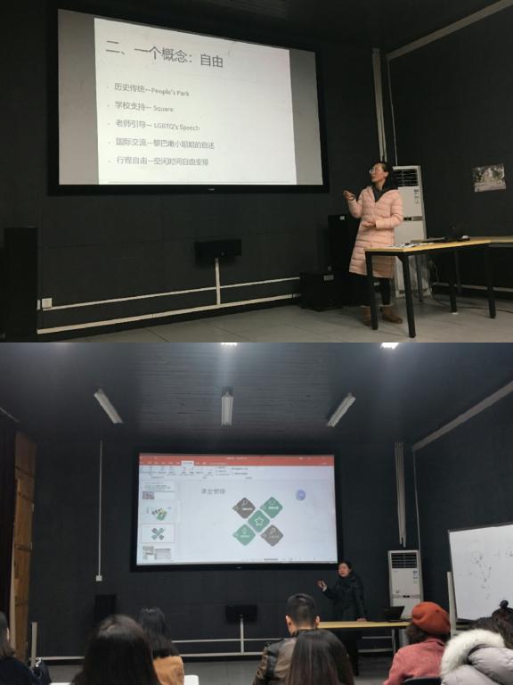 初到异国,在克服文化休克之后,她们的目光不只是被国外与众不同的建筑吸引,一栋上百年的图书馆大楼,一个现代艺术博物馆,一个与同学席地而坐、谈天说地的草坪,而是随着交流的深入则更多的思考着中外教学、文化、生活、看待问题的视野和角度的差异。在被真正第一次“丢进”一个语言、文化、课堂、生活、交际完全未知的空间,才发现自己原来可以想到的,做到的那么多。“有时候,灵感就那么突然来临了,源源不绝”,“每天都有新的挑战和等待探索的事务吸引着我”,同学们的讲述也让听众想象着这样美好的体验。
