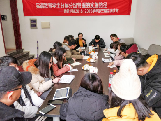 为了更好地探讨完满教育体系下学生分层分级管理实施路径,切实提高完满教育学生参与的覆盖面、活动组织宣传的针对性等,远景学院于2018年12月8日-9日组织了完满教育部分师生代表前往学校半山书院针对这一主题进行集中研讨。参与本次完满沙龙的有曾明珠副院长、辅导员郭淼老师、办公室曹嘉彧老师及远景学院二届三任部分学生干部。