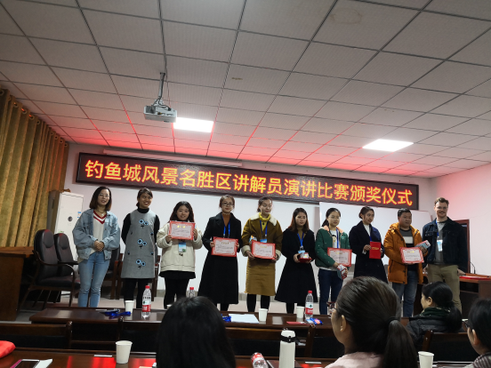 为进一步服务地方、贯彻校地共建的理念,加强与钓鱼城风景名胜区管理局的合作,在前期有关志愿者讲解员沟通合作的基础上,远景学院外教Peter,英语老师唐智盟,以及2015级辅导员杨敏三位老师受邀于2018年12月3日担任钓鱼城风景名胜区讲解员演讲比赛评委。