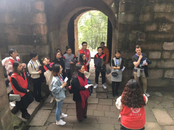 (远景学院的三位评委认真听志愿者英文讲解钓鱼城)