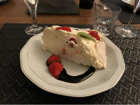 虽然吃着西餐,我们却丝毫没有感觉到拘谨。Peter和Bronagh的热情深深感染着我们,我们不禁陶醉了,一边吃一边很开心地聊各种各样的话题,从生活到艺术,从欧洲到亚洲。主食结束后Bronagh为我们准备了爱尔兰蛋糕,不像传统的甜点,这道甜点里没有面粉,只有蛋白,甜而不腻入口满香四溢,正在减肥的我也忍不住多要了一块。