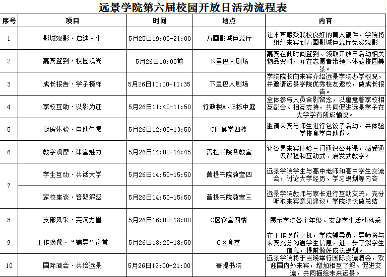 首夏犹清和,芳草亦未歇。2018年5月26日,为加强与社会各界的沟通与交流,展示学院办学理念、办学情况和人才培养模式,远景学院在校内隆重举办了第六届校园开放日活动。邀请社会各界人士走进校园、走入寝室、深入课堂、深入活动,全面了解学院学生的所学所得,为了让来宾更加直观、更加真实和立体的感受学院,远景学院精心设计了一系列活动安排,可谓亮点纷呈。