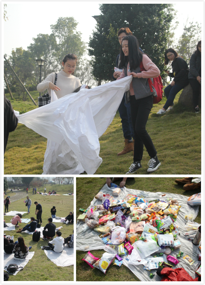 午饭时间到了,大家将准备好的垫子铺在草坪上,大家围坐成一个圈,在曾老师的带头下大家把各自带的食物聚集到垫子中间,一会儿,一座食物堆成的小山就呈现在所有同学的面前。大家互相分享着美食,好一场冬日暖阳下的谈笑风生。