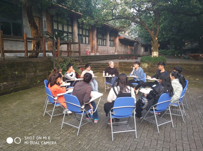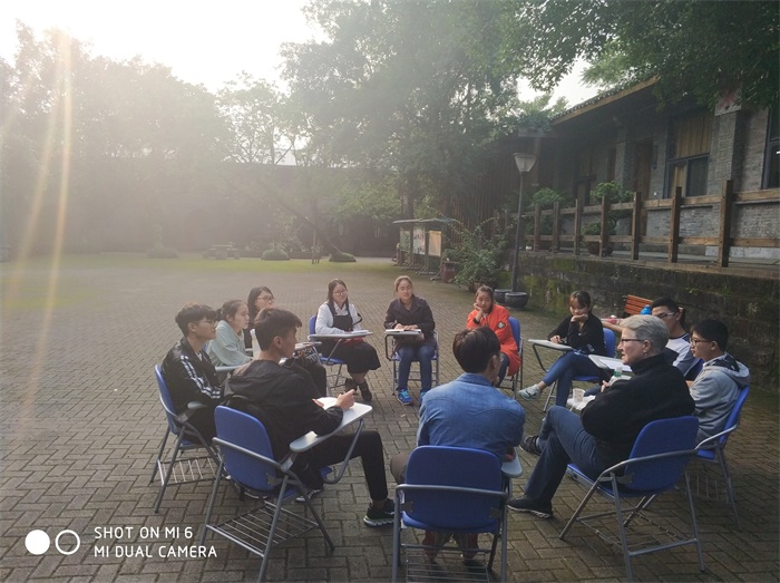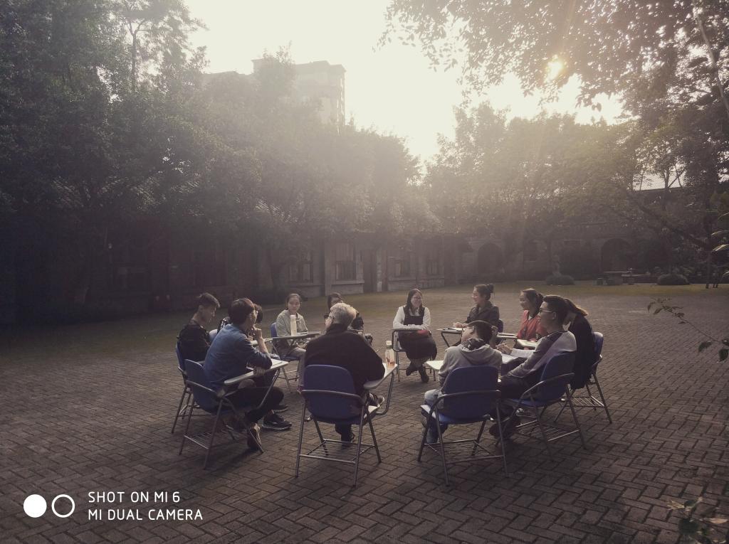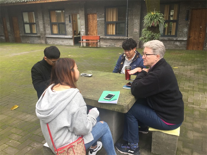 午后的阳光暖暖地洒在菩提书院的庭院中,为不辜负秋日难得的暖阳,关院长将座谈的地点由教室搬到户外。关院长与同学们围坐在一起用普通话拉开了话匣子,她介绍了举行座谈会的目的,她希望同学们把她当院长、更把她当知心朋友,希望每个同学能畅所欲言,她问大家虽入学只有2个月左右的时间,是否已经认识了远景学院内的所有老师,每个人都是否了解自己的专业。