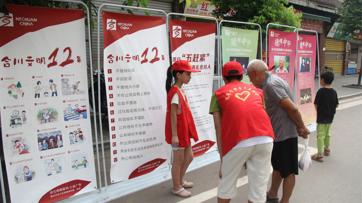 燕窝镇上,志愿者们带着稍大一点的孩子在进行创建文明城区宣传。与此同时,志愿者们为留在荣毅小学的年幼一些的孩子开展了“七彩课堂”之讲文明树新风主题课堂,对孩子们进行文明道德素质教育,将文明宣传深入基层。志愿者在黑板上写出“合川文明十二条”,和孩子们一起诵读,为孩子们一一解读其中的意思。有的年幼的孩子依然不能理解其中的“奥义”,向志愿者提出疑问,志愿者为他们悉心解答,从一问一答中将文明植入他们的内心,教导他们文明应该从小做起,文明不止于言,文明应该从行动中体现。