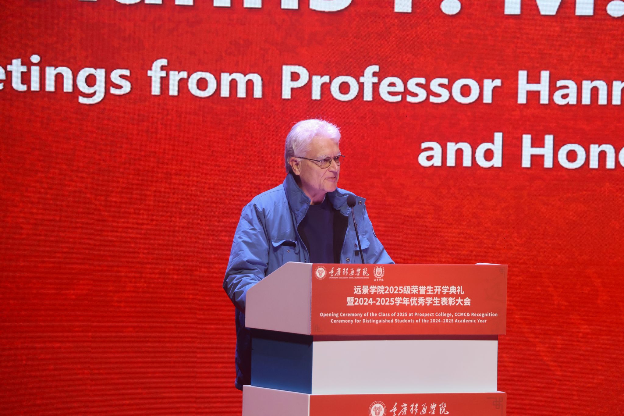 罗斯福精英学院创始人、远景学院荣誉院长汉斯教授在致辞中,首先向成功入选远景学院的2025级新生表示热烈祝贺。他特别指出,在大学中,向同学学习、与来自不同背景的同伴互动至关重要,这有助于理解差异、深化思考。作为学院14年发展的引路人与见证者,他深情回顾了远景从一片残垣断壁中拔地而起的创办历程,他欣慰地表示:“这份教育的责任,正被很好地承担着。”远景学院已成长为一所让学生在如家般环境中学习、并享有良好声誉,并对学院未来的发展寄予厚望。