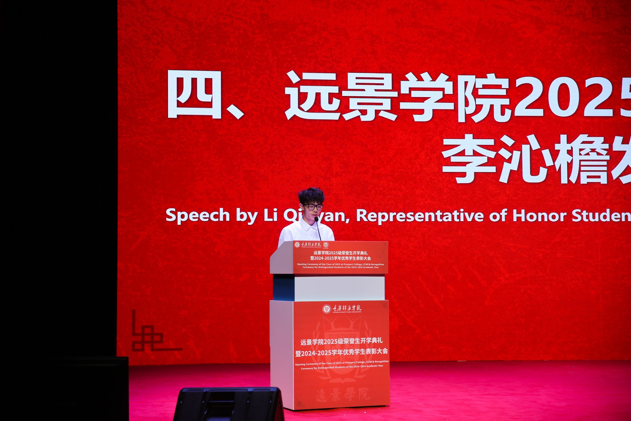 2025级荣誉生代表李沁檐同学在发言中,深情回顾了面试时老师鼓励的微笑如何消融了他的紧张,并让她深切感受到远景学院的包容与温暖。他表示,“荣誉生”称号不仅是光环,更是一份责任。体现了新一代远景人既仰望星空又脚踏实地的思考,在通识教育的浸润中涵养智慧,在跨学科交流中激发创新,将个人的成长融入学院发展的脉络,共同书写远景精神的新篇章。