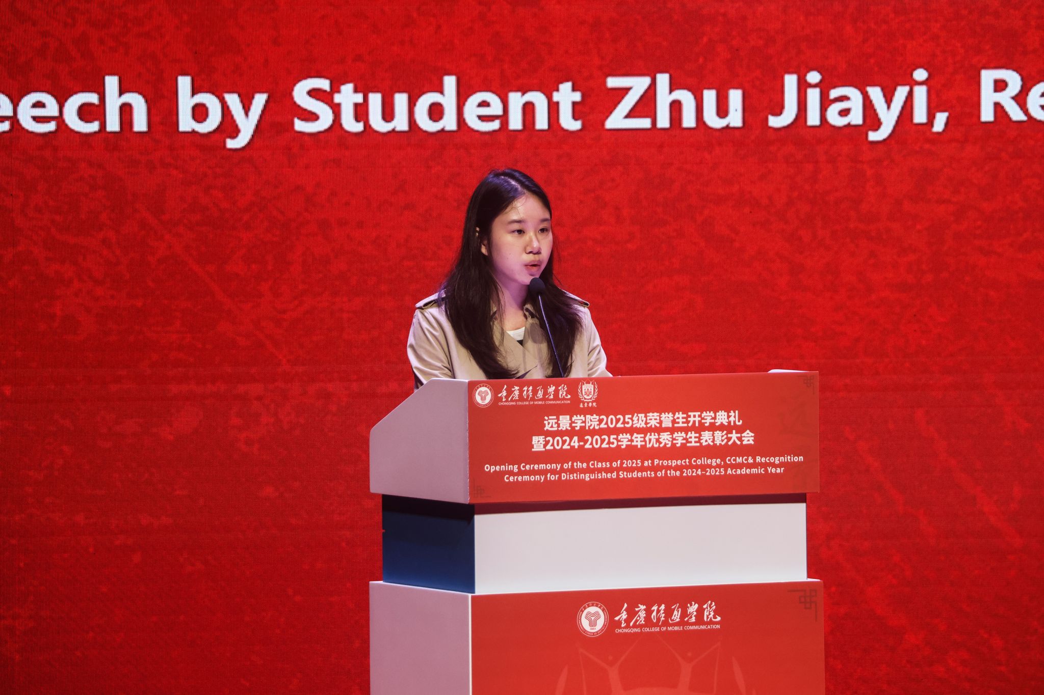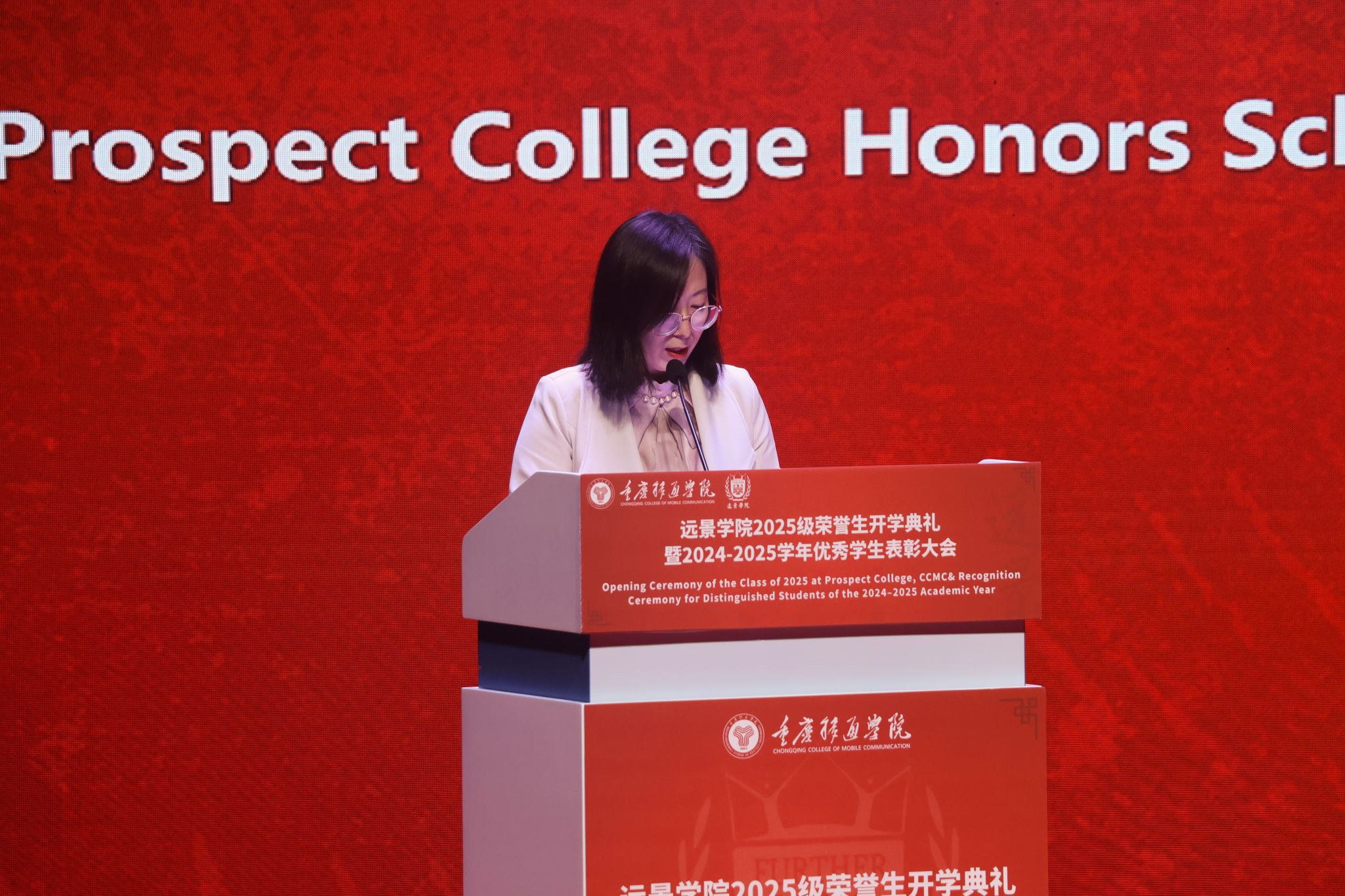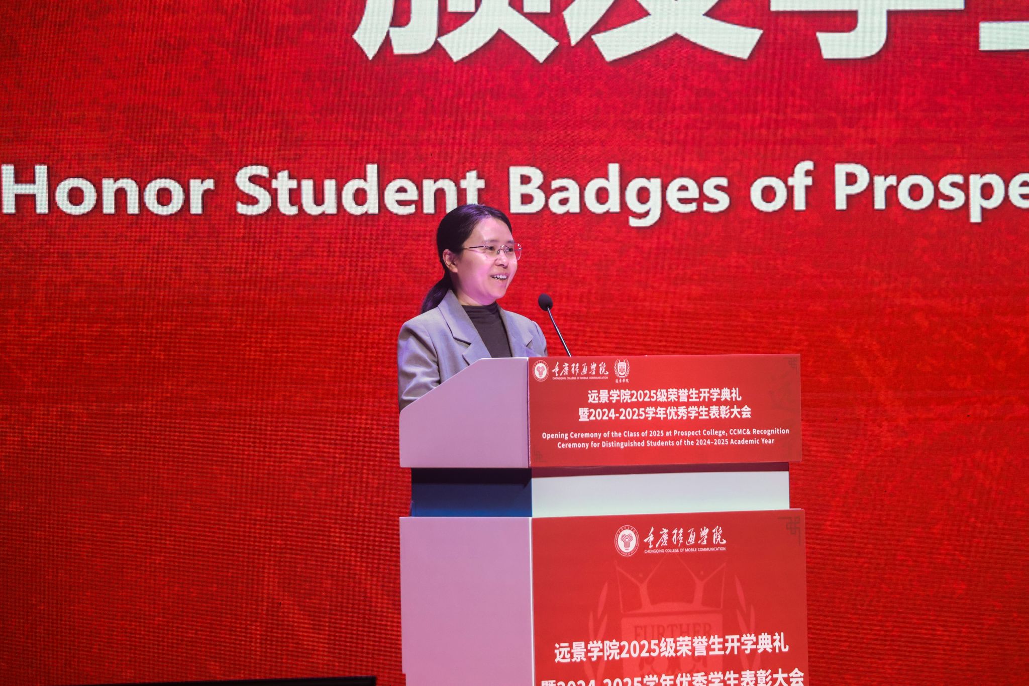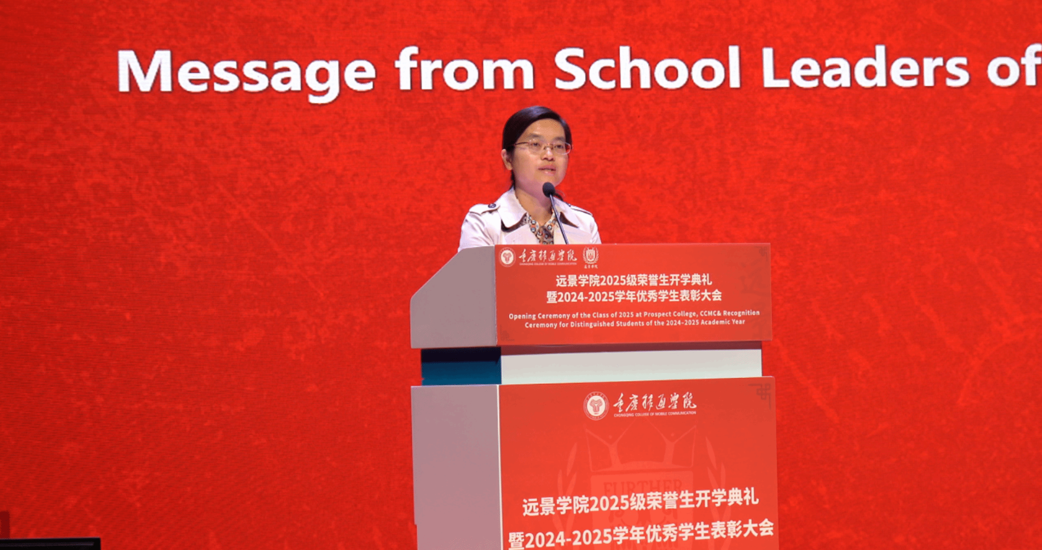 重庆移通学院校长助理刘枚作总结寄语。她回顾了远景学院十余年来在精英人才培养上的探索与成就,并代表学校向新生表示欢迎,向受表彰同学表示祝贺。她对全体学生提出四点期望:立大志,涵养家国情怀,摒弃利己主义;求大学,练就融会贯通本领,主动构建知识体系;行大道,坚守独立人格,恪守道德底线;担大任,激发创新锐气,勇做时代行动派。她强调,学校将全力支持每一位学生的成长,希望大家不负韶华,在远景的沃土上深耕梦想,书写灿烂篇章。