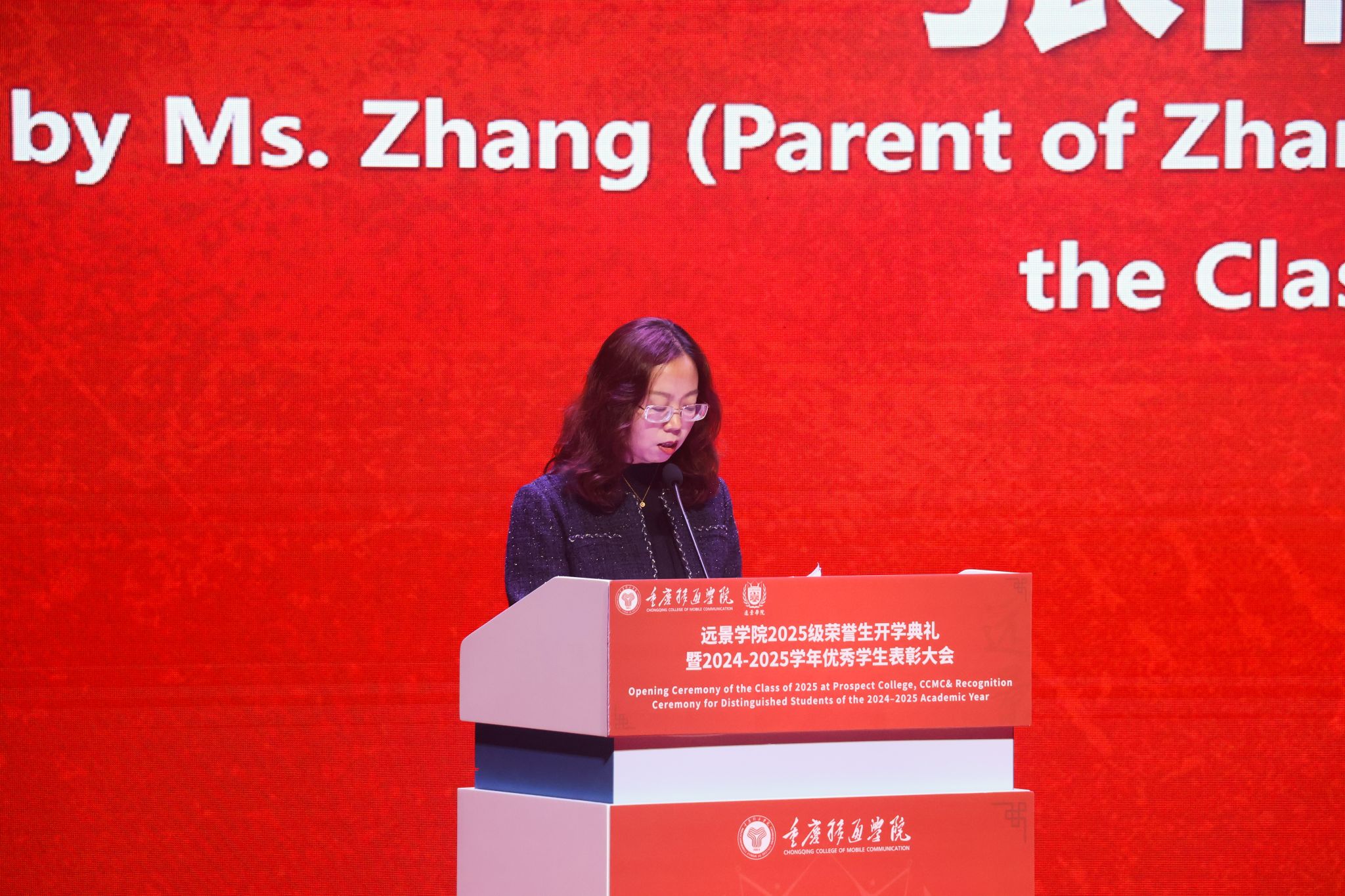 2025级荣誉生张南开同学的家长徐佳女士随后发言,她代表所有新生家长向学院领导与老师致以衷心感谢,并分享了父母看到孩子独立成长时“骄傲、期待与不舍”交织的复杂心情。她以家庭“第一课堂”的视角,深情表达了对远景“跨学科融合、小而精培养”育人模式的高度认可,并寄语孩子们在大学四年中常怀感恩、无畏风雨、勇于探索,努力成长为有温度、懂担当、身心健康的完整而丰盈的人。