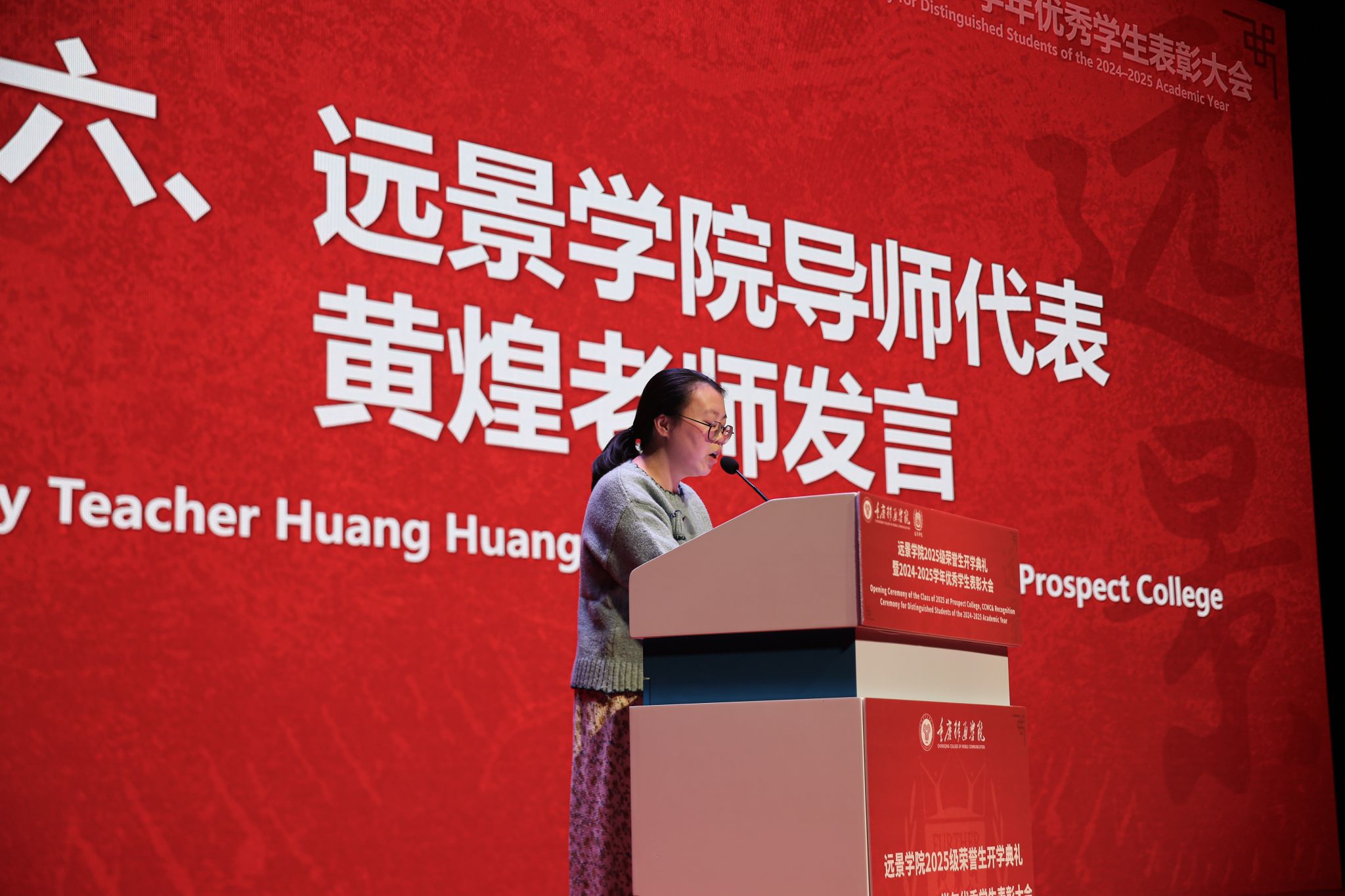 导师代表黄煌老师以中英双语分享了她受海外导师启发而立志成为与学生建立心灵联结的育人者的经历。她强调,导师的角色远超学术指导,更是成长路上的同行者。她鼓励新生们珍惜光阴,将选择化为坚定的行动,在时间的沉淀中书写属于自己的无畏篇章,去看更广阔的世界,拥抱更光明的人生。