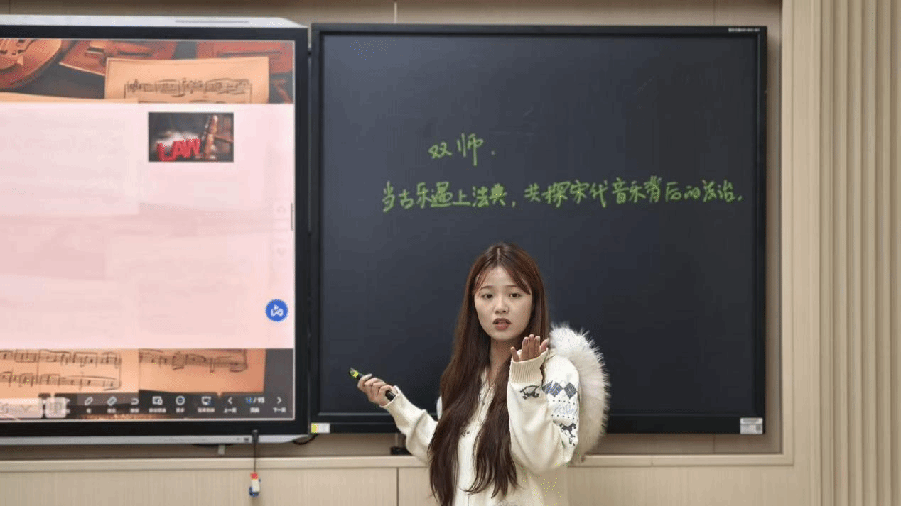 整堂课在音乐与法律的交织碰撞中高潮迭起。郭老师以艺术视角还原历史场景,李丹老师以法学思维剖析制度逻辑,二者相辅相成,打破了学科壁垒。此次双师授课不仅是对宋代音乐文化的深度挖掘,更是对跨学科教学模式的成功实践。