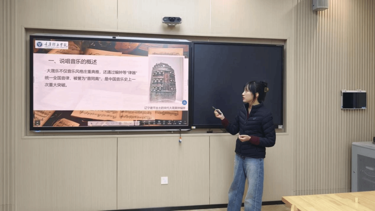 课堂伊始,郭老师以宋代音乐的历史地位为引,系统梳理了这一时期音乐发展的双轨脉络。一方面,宫廷音乐在“礼乐治国”理念下达到高度制度化,从教坊的设立到“大晟府”的乐律修订,无不体现皇权对音乐教化功能的重视;另一方面,市民经济的繁荣催生了陶真、货郎儿等民间音乐形式,其质朴生动的唱词与灵活的表演形式,成为宋代社会生活的鲜活注脚。“宋代音乐的魅力,正在于雅与俗的交融——既承载着礼制规范,又涌动着市井活力。”