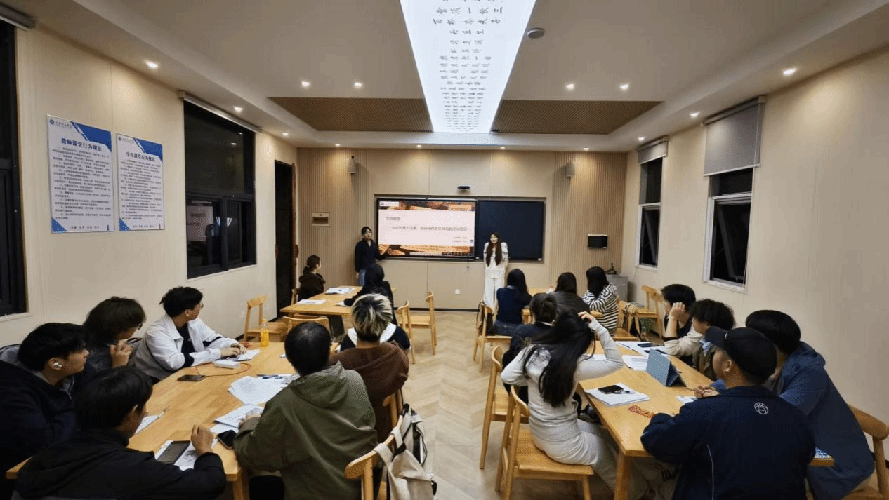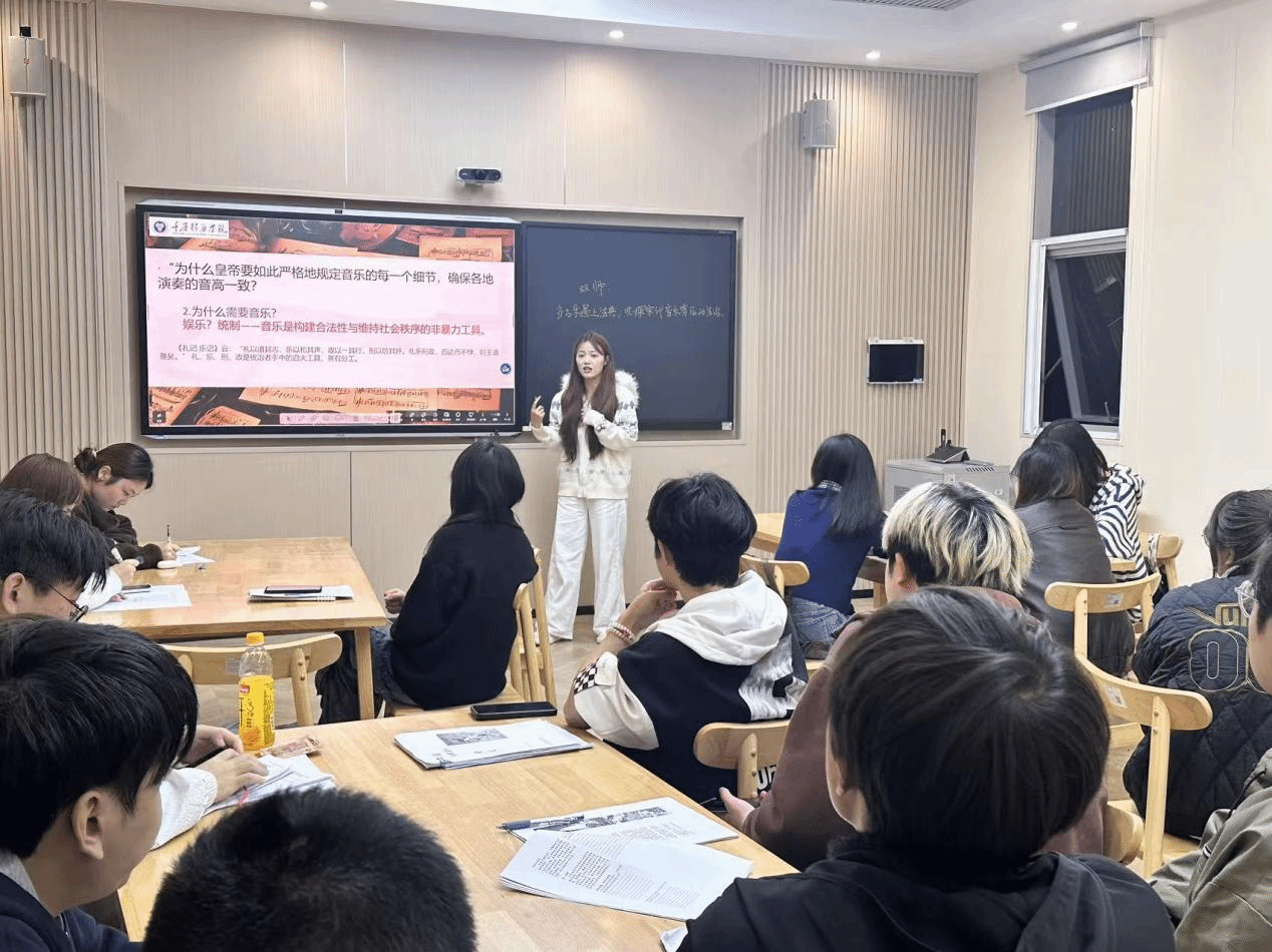 2025年11月13日晚,远景学院的郭杨老师开展了一堂别开生面的“双师授课”。本次课程由俄罗斯拉赫玛尼洛夫音乐学博士郭杨老师发起,特邀西南大学法律学硕士李丹老师共同执教,以“宋代音乐发展”为脉络,不仅梳理了宫廷雅乐的建制与市井音乐的鲜活生态,更创新性地从法律视角切入,揭示音乐与政治、礼法、社会秩序的深层关联,为师生带来一场跨学科的思想盛宴。