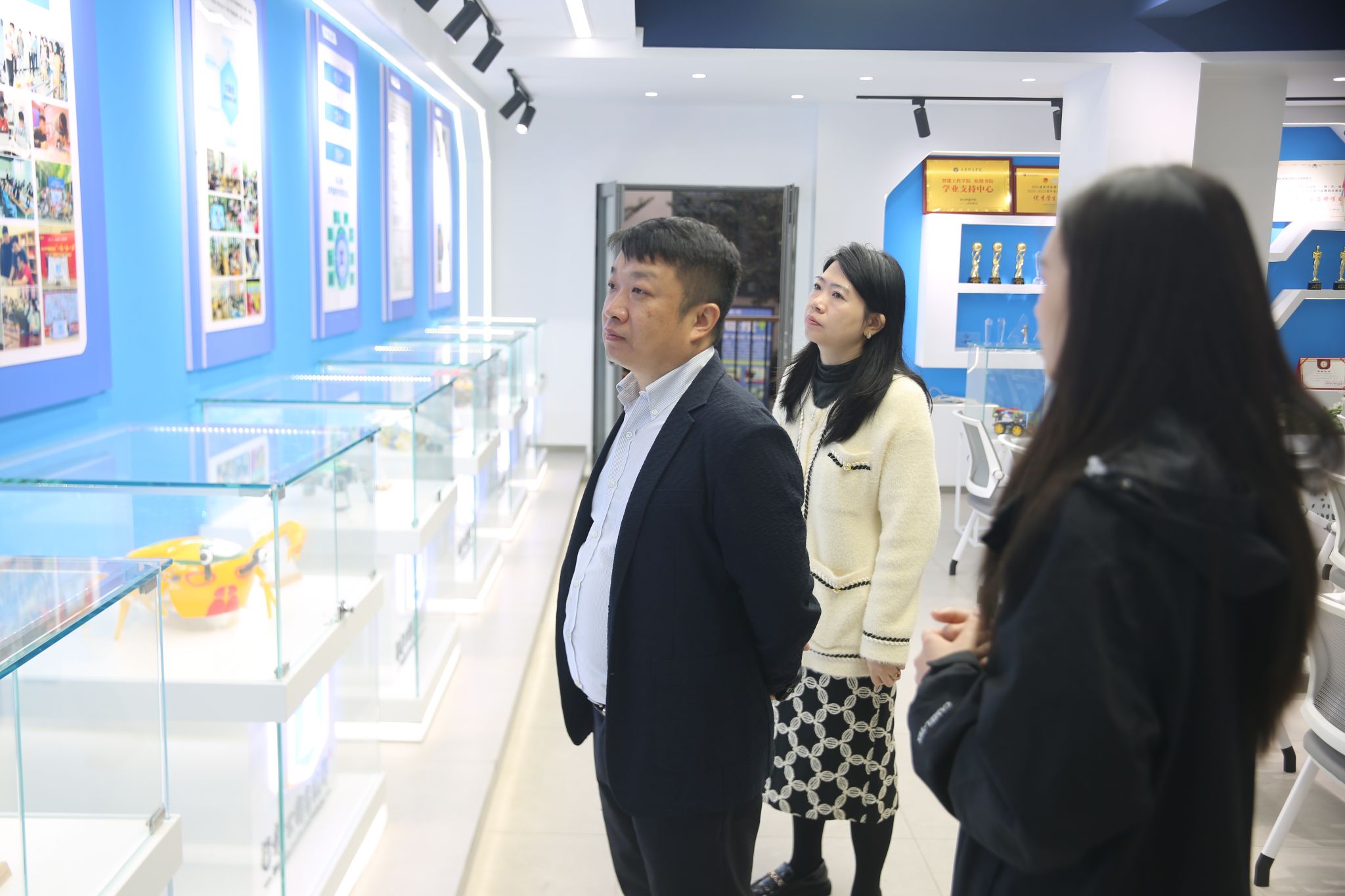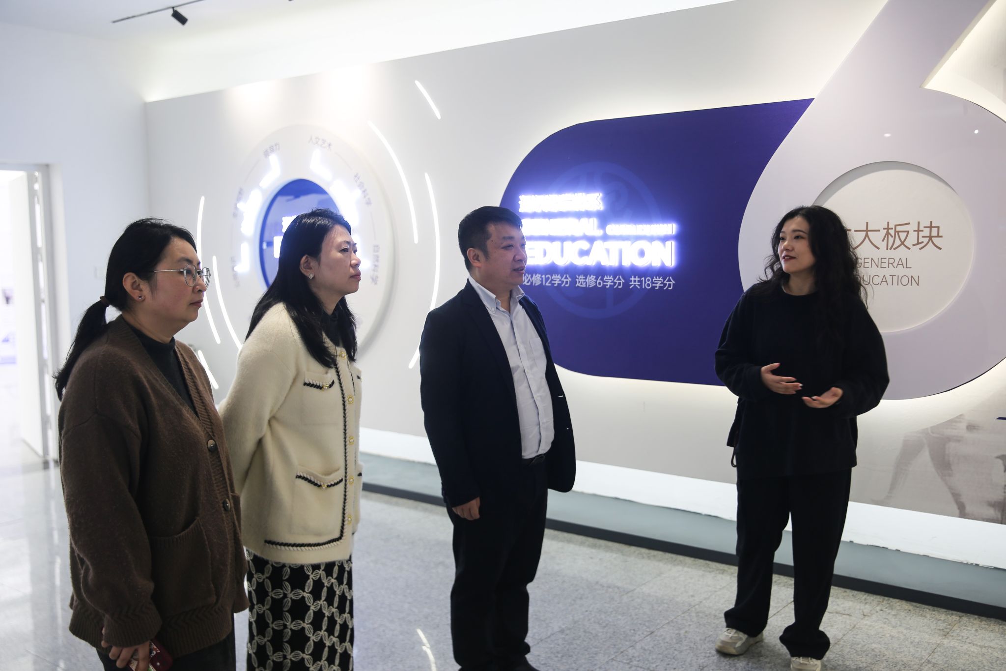 讲座开始之前,在远景学院副院长李梦瑶的陪同下,余建波教授先后参访了学校通识教育展厅、远景学院教学区、云端剧本杀学院以及松格书院、爱莲书院等特色育人空间。参观过程中,余教授对学校以“学生发展为中心”构建的浸润式育人环境表现出浓厚兴趣,高度评价了学校将育人理念深度融入物理空间、打造全方位成长生态的创新实践。他特别指出,重庆移通学院前瞻性地将前沿产业形态与书院文化共治融为一体,为学生创设了可触达、可感知、可参与的多元化教育场景,这正是面向未来的教育形态所需要的探索精神。