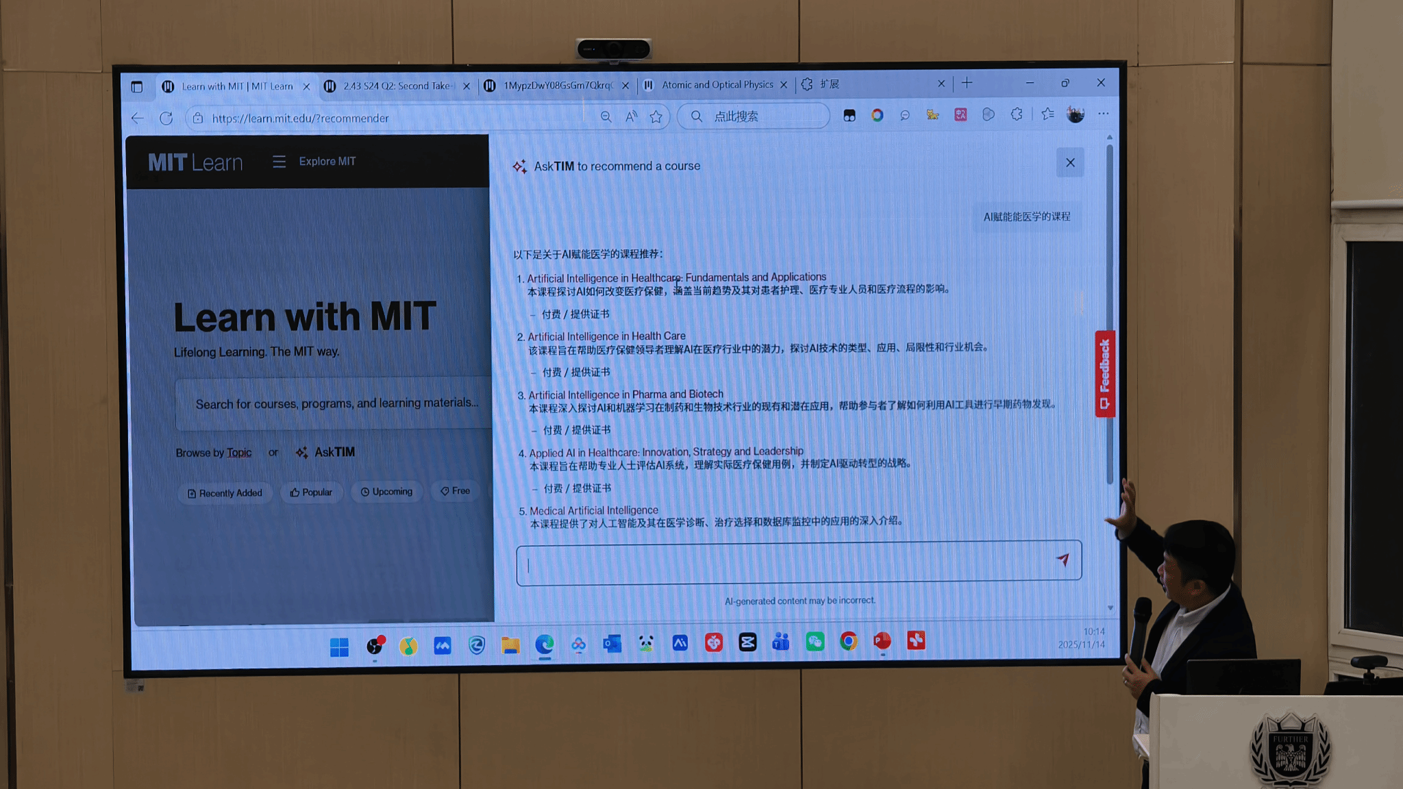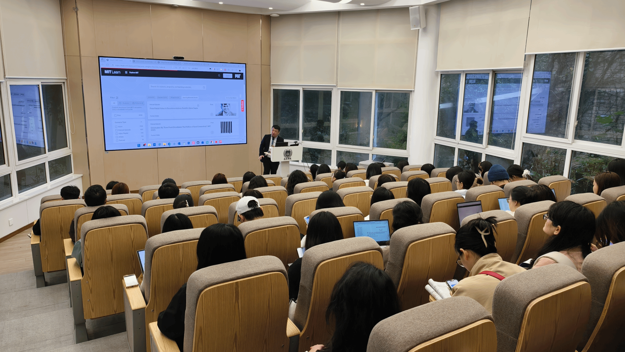 结合国内外顶尖高校的实践,余教授生动描绘了未来学习中心的蓝图。以上海交通大学图书馆和麻省理工学院MIT Learning Lab为例,他展示了学习空间从知识仓库向能力驱动演进。他特别提及一个引人深思的现象:“70%-80%的交大学生更倾向于在B站学习,甚至自称为‘B站大学毕业生’。” 这一趋势揭示了传统课程设计与数字化一代学习习惯间的张力,凸显了教育改革的必然。随后,他重点分享了哈佛大学在计算机科学概论课中深度集成AI助教的成功经验,展现了AI为实现全天候个性化学习提供的强大支持。