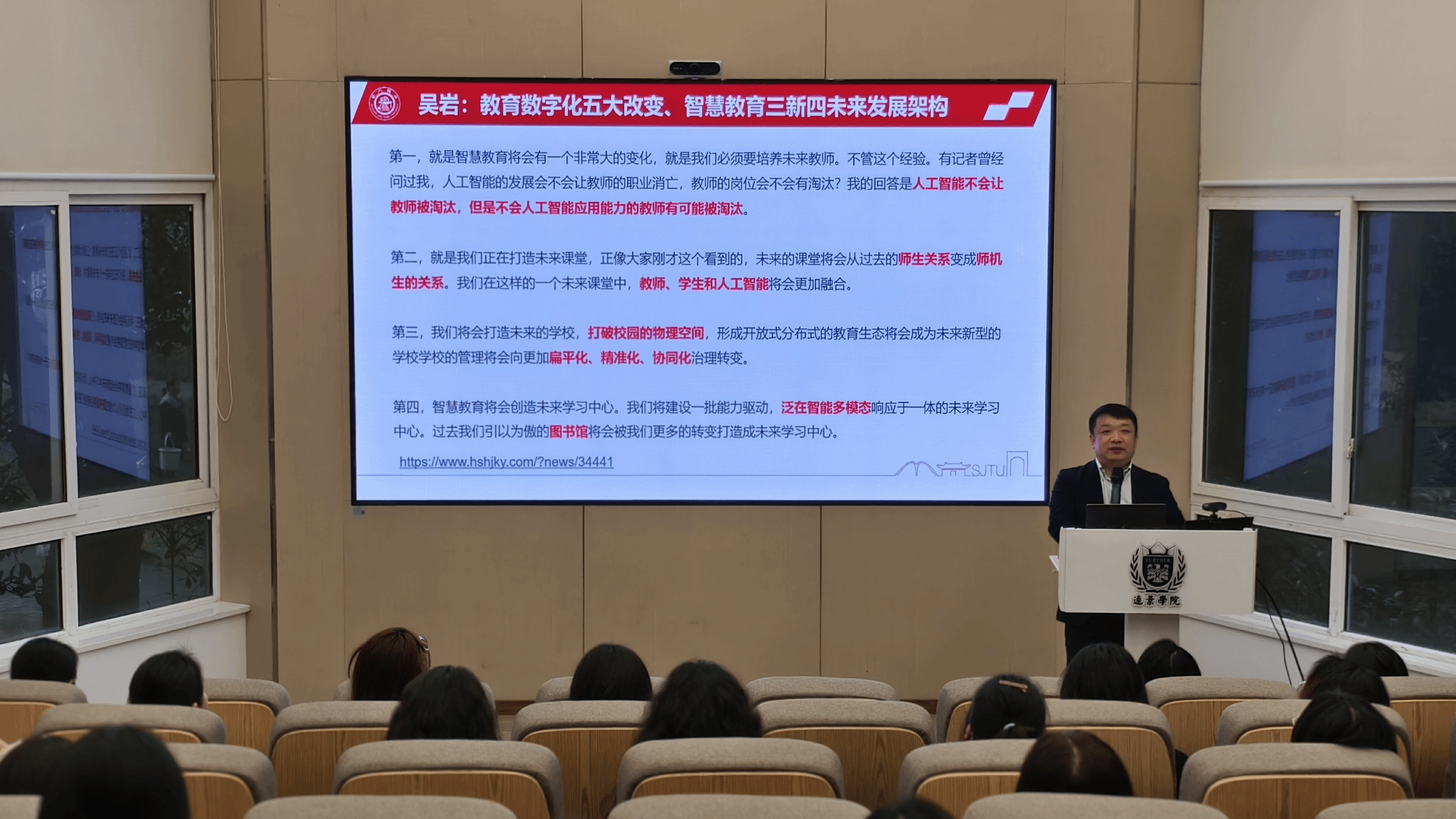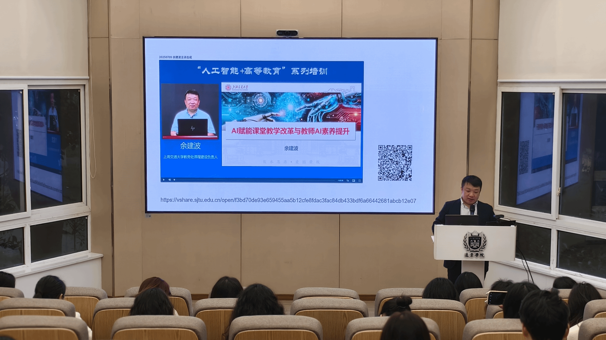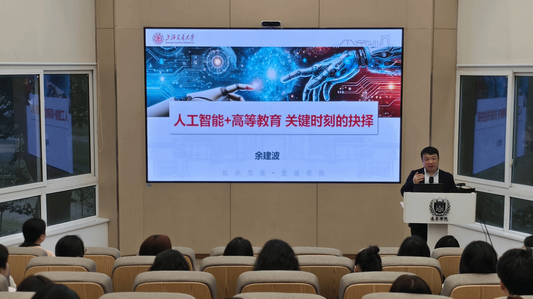 分享会特邀上海交通大学教务处课程建设负责人、知名课程设计专家余建波教授担任主讲。余教授以“人工智能+高等教育:关键时刻的抉择”为题,聚焦“未来教师、未来课堂、未来学校、未来学习中心”四个核心维度,系统阐释了以“学AI、用AI、护AI、创AI”赋能高等教育深刻转型的实践路径。
