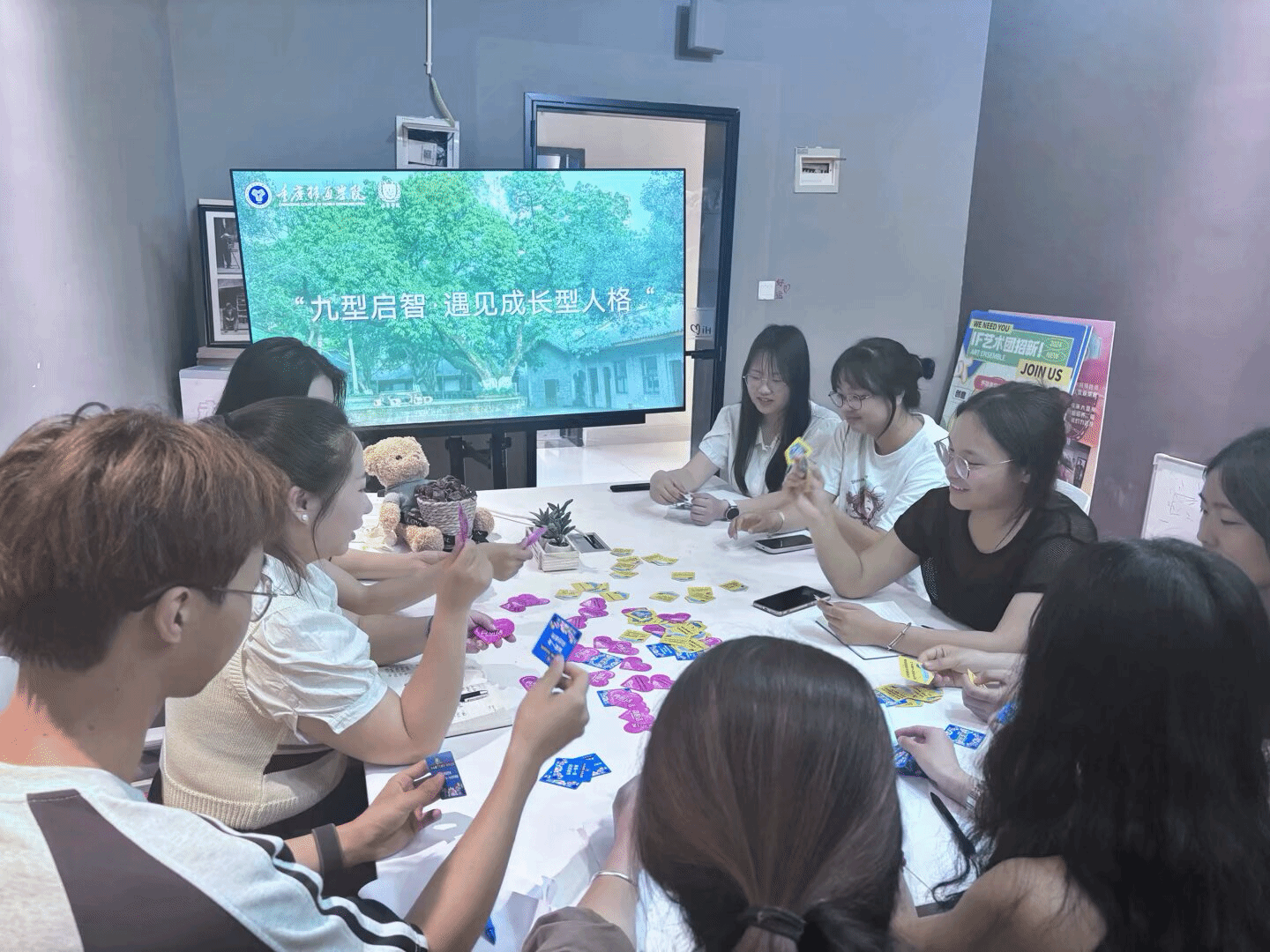 为引导学生深入认识自我,促进人格的健全发展,远景学院于2025年5月25日在远景书院101举办了以“探索心灵图谱,共塑完满人格”为主题的心理健康教育活动。本次活动融合专题研讨、创意手工、真心卡牌趣味互动,通过九型人格理论为载体,带领心理委员们开启一场探索自我与心灵成长的奇妙之旅。