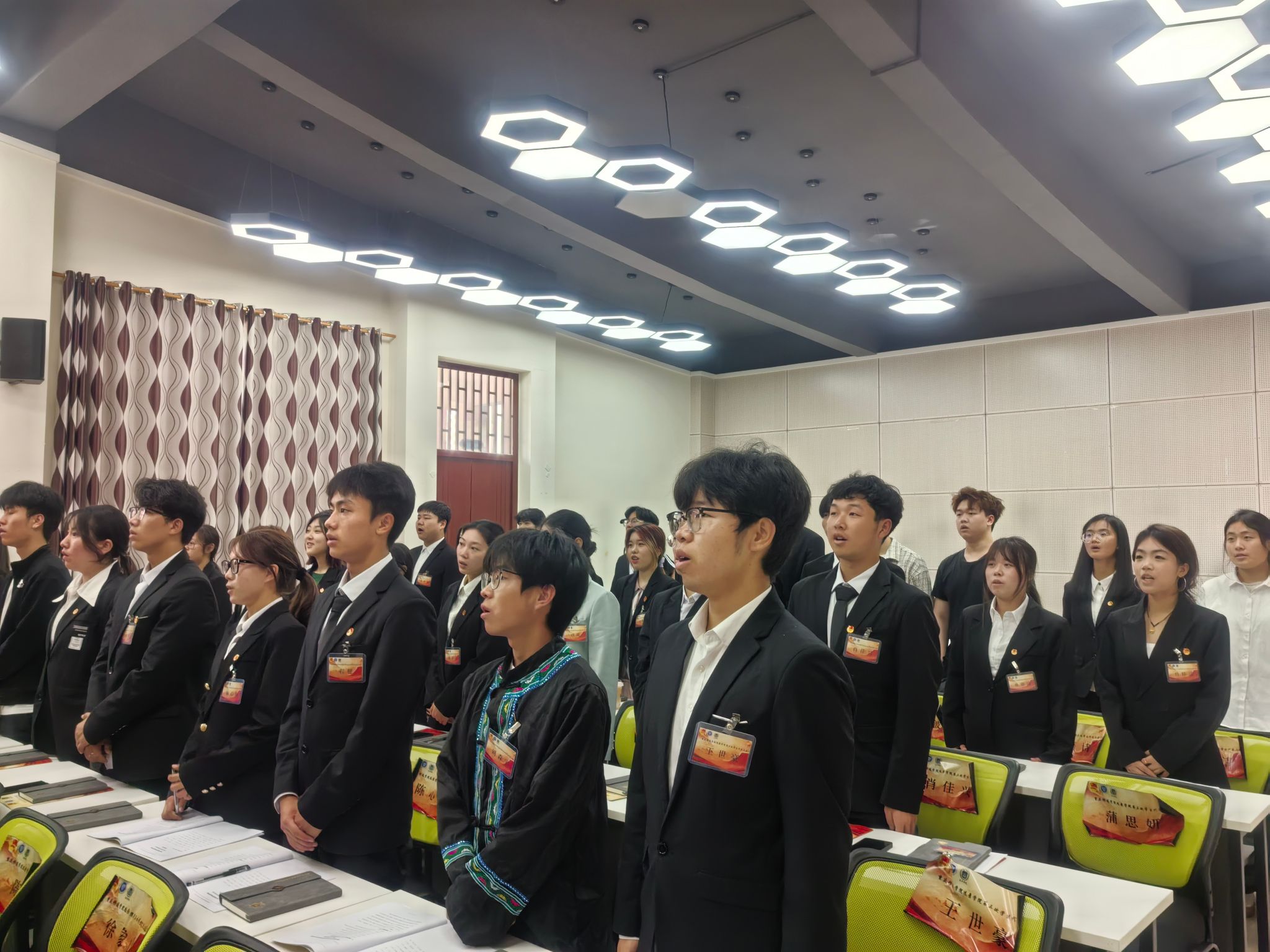 会议伊始,全体参与人员起立,庄严肃穆齐唱国歌,接着由校学生会执行主席何杰同志和团总支学生会指导老师周义巧同志宣读同意召开本次会议的批复,并向此次大会召开表示祝贺。