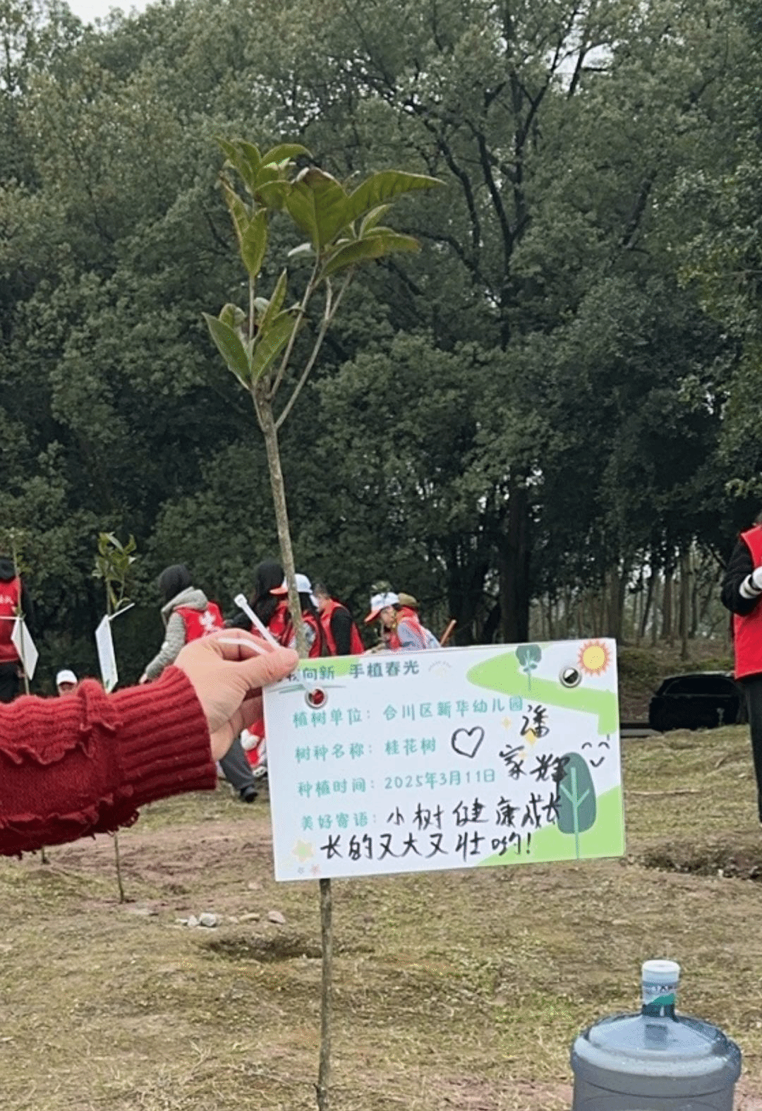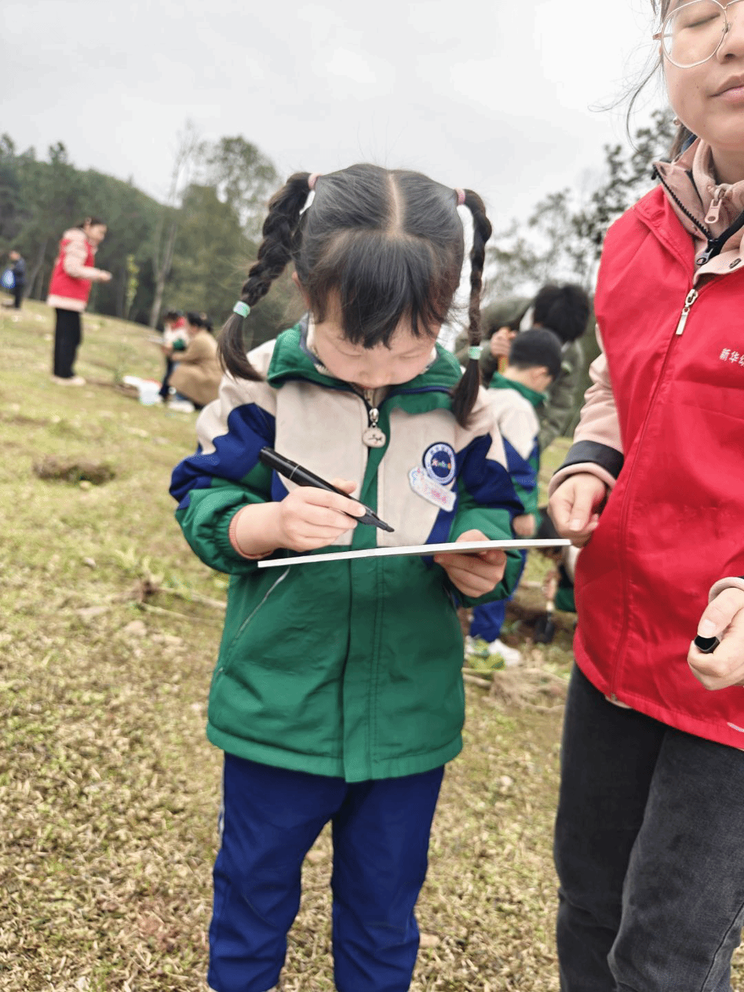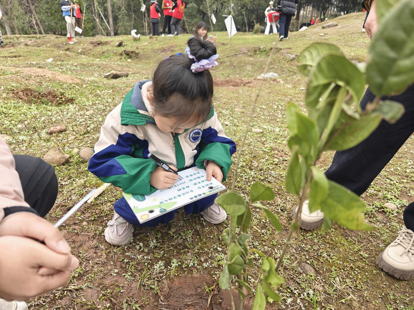 在植树过程中,参与者们纷纷拿起笔,在精美的挂牌上写下对树木的祝福和寄语。这些寄语或诗意盎然,描绘着树木未来枝繁叶茂的景象;或朴实真挚,表达着对大自然的热爱与敬畏。每一个挂牌都承载着他们对未来的美好愿景,更象征着他们对环境保护的责任与承诺。一位小朋友在寄语卡上写道:“愿同小树苗一起茁壮成长。”这稚嫩的话语不仅表达了对小树苗的期待,也象征着小朋友希望自己能像小树苗一样,在阳光雨露的滋养下,健康快乐地成长。