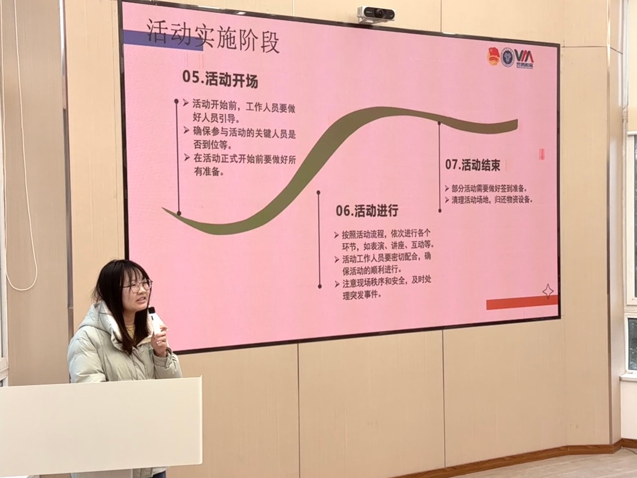 姜伊还提到,物资准备、场地布置和节目彩排是活动成功的关键环节。在物资准备方面,她分享了制定详细预算清单、提前采购物资以及确保设备正常运行等经验,指出物资准备不仅要数量充足,更要注重质量可靠,以确保物资在活动中发挥最大效能。在场地布置上,团队提前对现场进行布置,仔细检查音响、投影仪等设备。姜伊提醒,布置完成后需多次检查,确保细节无误,营造美观且实用的空间环境。节目彩排是降低风险、优化流程的重要环节。姜伊指出,彩排能帮助参与者熟悉流程,及时发现问题并解决。在活动中,团队进行多次严谨彩排,力求尽善尽美。她建议彩排时应模拟真实场景,严格按正式活动标准执行。