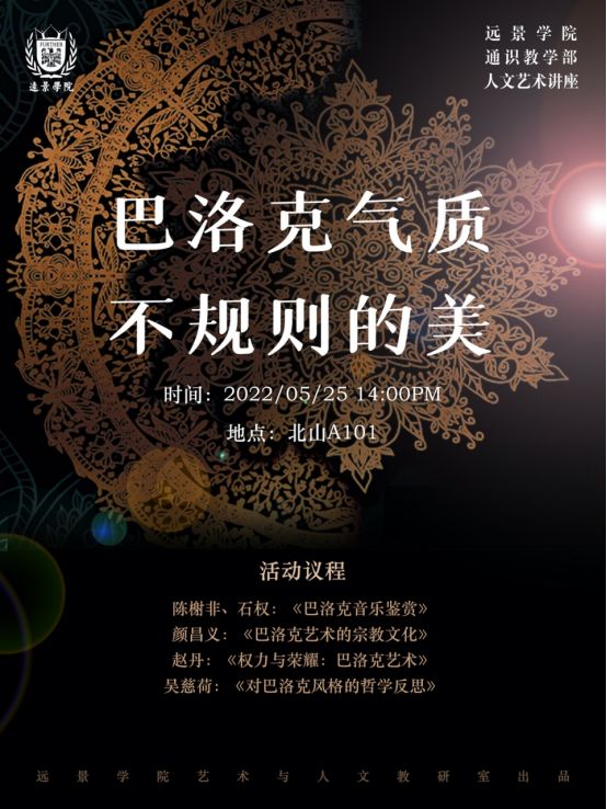 各位教师将从音乐鉴赏、历史文化、艺术视野、哲学思考四个角度,依次做主题相关内容介绍,带领大家一起探究巴洛克艺术的魅力,让我们一起期待各位老师的精彩分享。现活动已通过悠学派发布,感兴趣的同学速来报名哦!